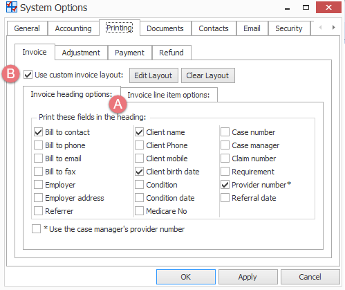 Note that you can also customise the heading/line item settings and/or the invoice layout for particular customers or for particular categories of work.