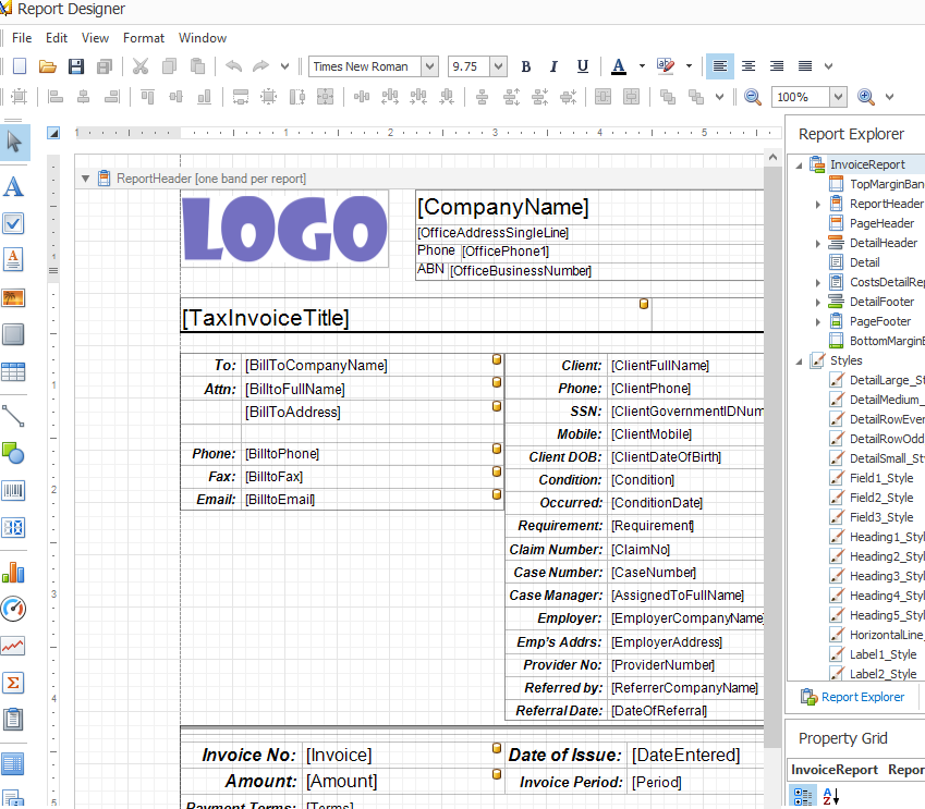 To design the invoice layout check the Use Custom Invoice Report Layout box and click Edit Layout. The Report Design tool will open.