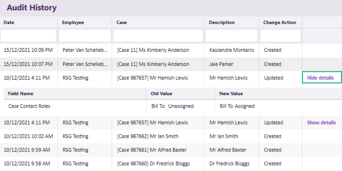 Users with the appropriate permission will be able to see a View History button on the pages of your Case Manager system (listed at the top of this page) that maintain an audit history: