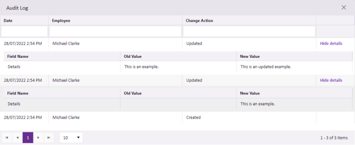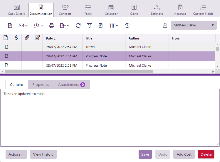 * The Audit History feature will track all changes made to Plain Text, Formatted Text, SMS and Email document entries. However, changes made within external documents such as Word, Excel and PDF are not able to be monitored or recorded.