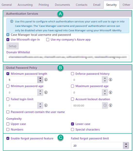 The first section covers the settings required to set up for Microsoft, MFA and Case Manager.