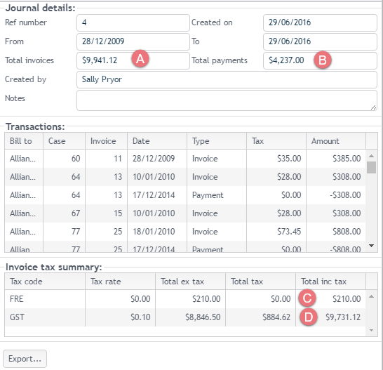 The top third of a journal displays the journal details, including summaries for Total Invoices (A) and Total Payments (B) The middle third displays a list of the accounts transactions included. The bottom third displays the tax totals included in the invoices and adjustments, separated into totals including tax (C) and totals that are tax-free (D).