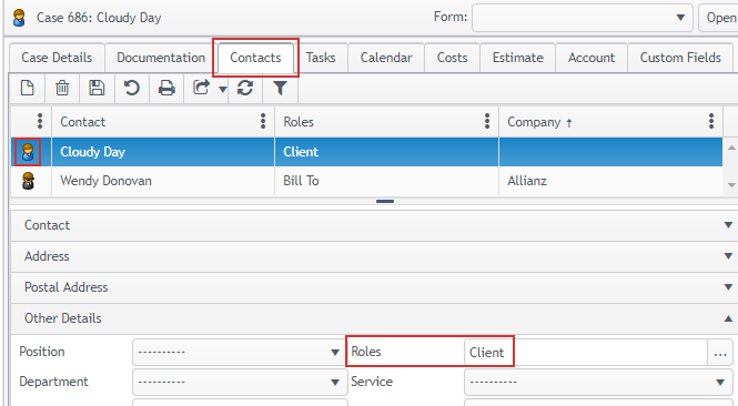 Contacts are usually allocated specific roles in the case. This can be indicated by icons: