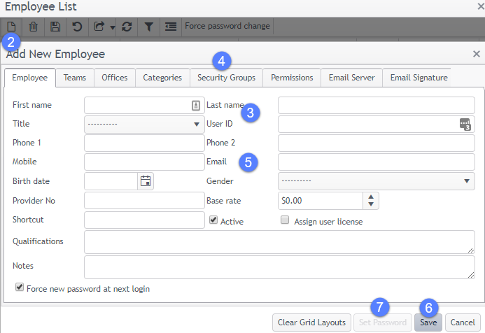 to create a new employee in the list. - Enter the most important details: your first name, last name and username.