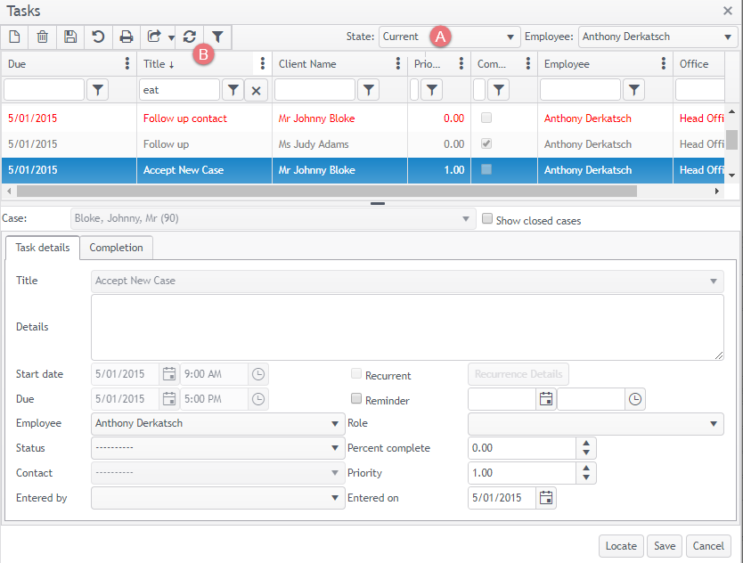 You can also manage all tasks you are responsible for across multiple cases using your list of Tasks. This task management tool allows tasks to be sorted and filtered according to priority. Compared to searching for tasks in individual cases, this is much more efficient.
