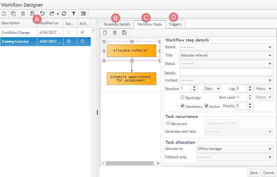- Template Details: summary details of the selected workflow are displayed, including notes and whether it is active.