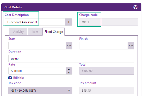 When you add a cost to a case, you select an activity and enter the duration or number of items. If the activity has a linked charge code this automatically becomes part of the cost.