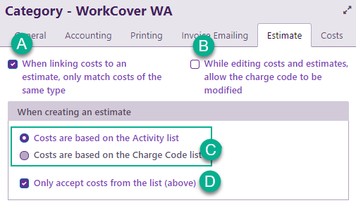 The option at A below specifies that the type of each estimate cost can restrict the activities that can be added. See the example below.