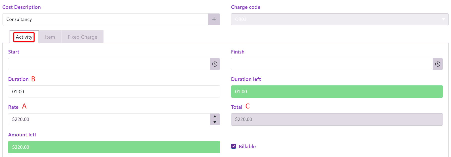 The total cost (C) is calculated by multiplying this rate by the Duration (B), i.e. the time spent on this activity.