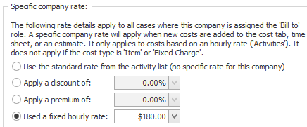 The company rate applies to all Activity costs added to a case or case estimate when the company is the case's Bill To contact. This rate does not apply to Fixed Charge costs or Item costs. You set the rate at the Company Settings tab for the company in the Company List, see Company settings: