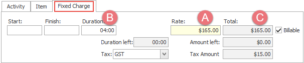 For Fixed Charge costs the rate refers to the total rate of the charge. When a cost is added the Duration (B) is entered, as for Activity costs above, but the total cost (C) is uninfluenced by this and is calculated only from the cost rate (A). Thus, here the rate represents the entire value of the cost.
