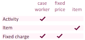 - Fixed charges for work performed by a case worker where a flat fee is charged, for example an initial assessment.