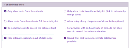 However, unlike with estimates policing through activities, estimates policing through charge codes do not have an option to enable costs to be entered both from the estimate and from the activity list.