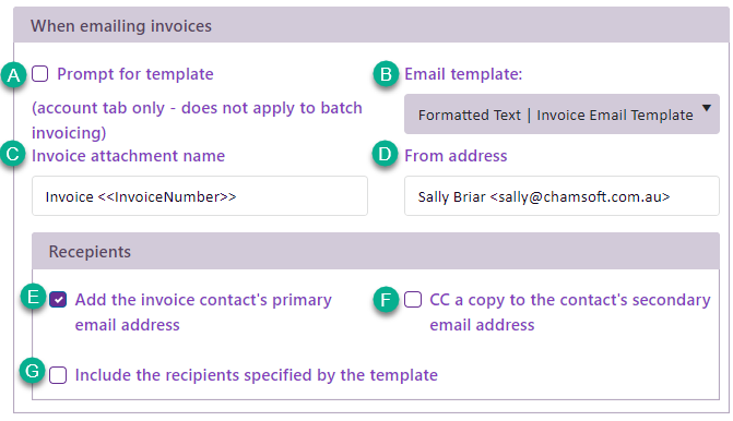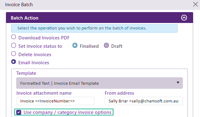 At all three levels you have the same options, including invoice email templates, invoice naming conventions and the address the invoice email is sent from: