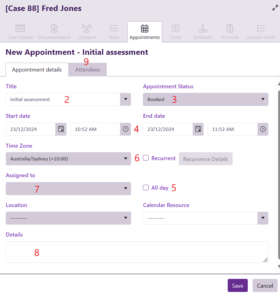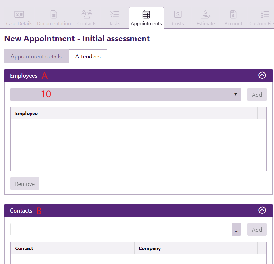 4. You can add employees (A) and case contacts (B) to the appointment.