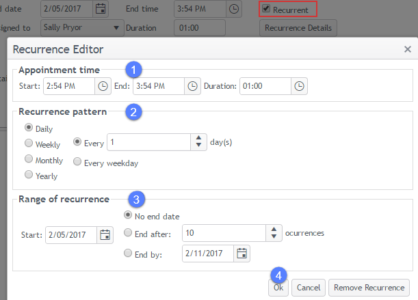 6. To create a recurrent appointment click the Recurrent checkbox and enter recurrence details, see below.