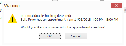 When creating/modifying an appointment, you will be warned about potential double bookings where the new appointment would overlap with an existing appointment for anyone listed as attending. This includes the assigned user, other employees and case contacts.