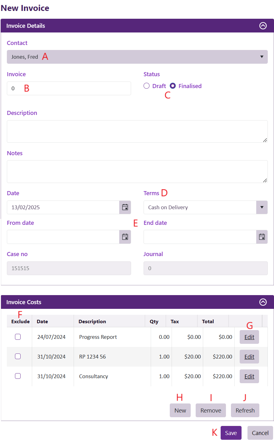 - Click New to add a new cost to the case and include it in this invoice. To enter cost data you need to show cost details (E). See Add cost for details about entering a cost.