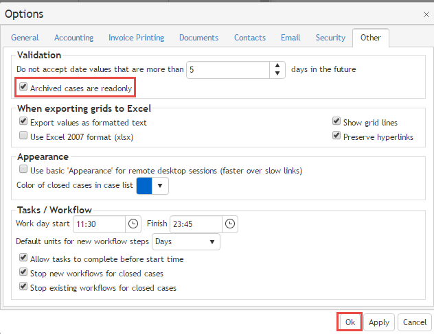 To do so, select the checkbox for Archived cases are readonly and click OK.