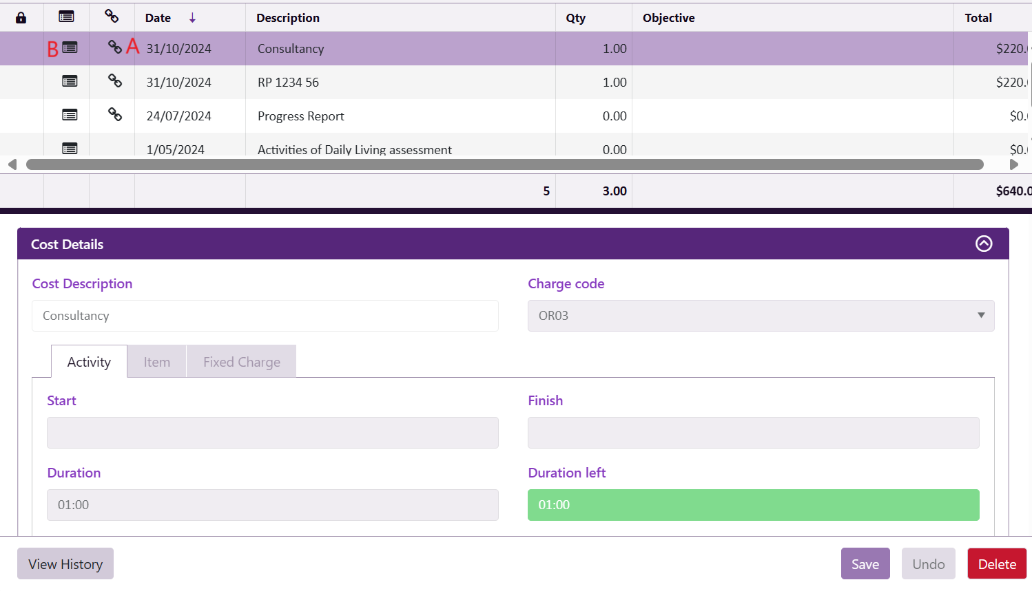 Costs can be added and possibly deleted using the buttons at the top of the grid.