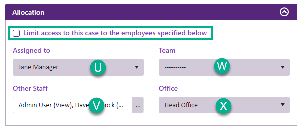 The Limit access to this case to the employees specified below checkbox limits access to this case to only those specified at U and V below. Thus, it prevents employees accessing the case via their team, office or category memberships or via the Can view all cases permission. Full details of the control of case access are at Access to cases.