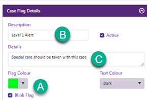 The case flag system is customisable. You can design different flags, flag colours and options. Flags can also be restricted to certain case categories. This is set up at the Case Flags List.
