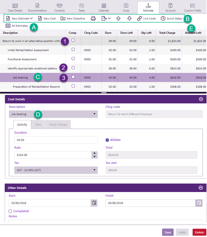 To access a list of all of the estimates for this case click All Estimates (at A in the screenshot below). You can select another estimate from this list.