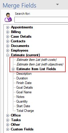 More detailed estimate information can be included in Word document templates via the tabular estimate merge fields highlighted below.