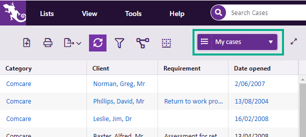 The Case List Criteria enable you to quickly change the Case List display. Collections of criteria settings are saved as views. There is always one saved view in operation at any time and it is simple to change views. See Case List Criteria for full details.
