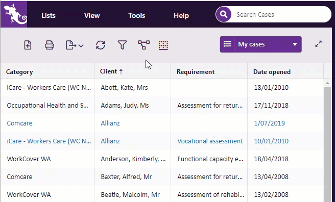 Thus, at the Case List the standard grid tools available to all grids apply to the results of the Case List Criteria settings in the current saved view. The Case List has