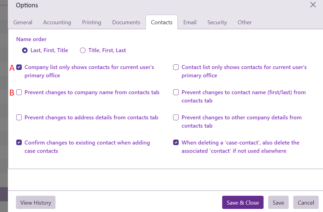 2. Click the checkbox to turn on office filtering for the list of contacts displayed when linking a new contact at the Contacts tab and when adding a new case.