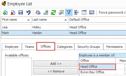 Office filtering shows only the companies and contacts that are allocated to the current user's primary office. This is the office that appears at the top of the list of offices that the user is a member of in the Employee List: