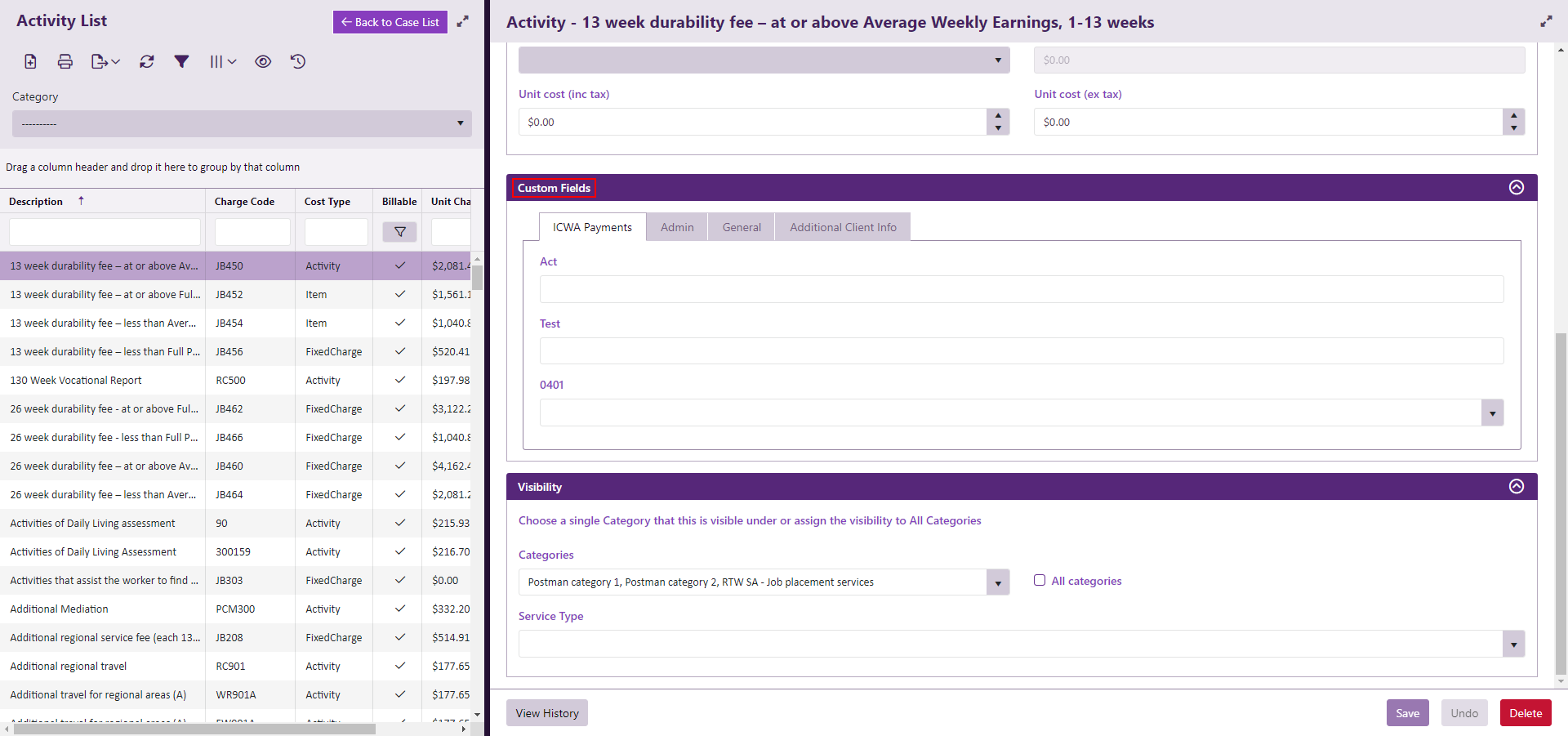 A set of Custom Fields can be added to your Activity List to store relevant cost details.