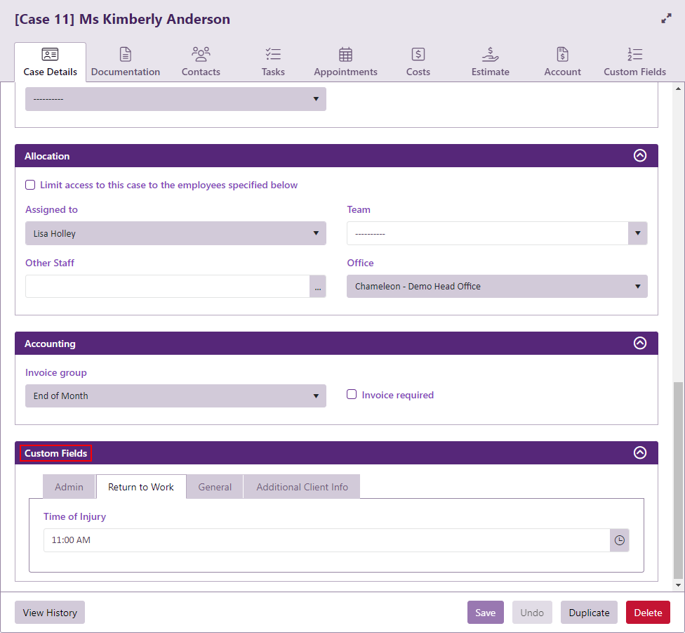 A dedicated Custom Fields section can be added to this tab to store relevant case details.