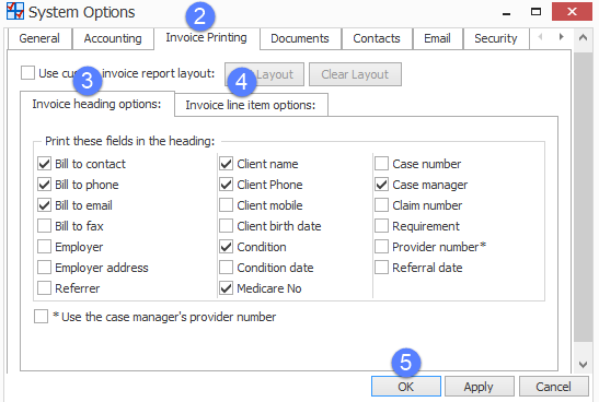 - Select the Invoice heading options tab and select the checkboxes for the information that you want in the invoice heading.