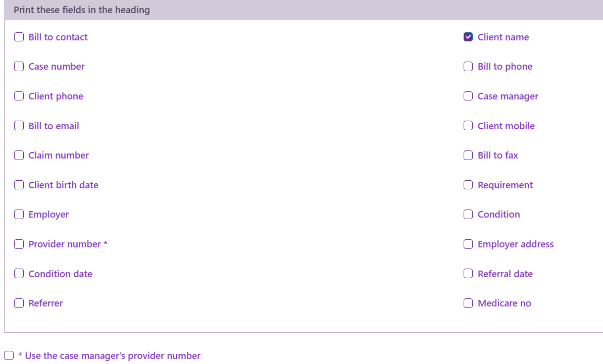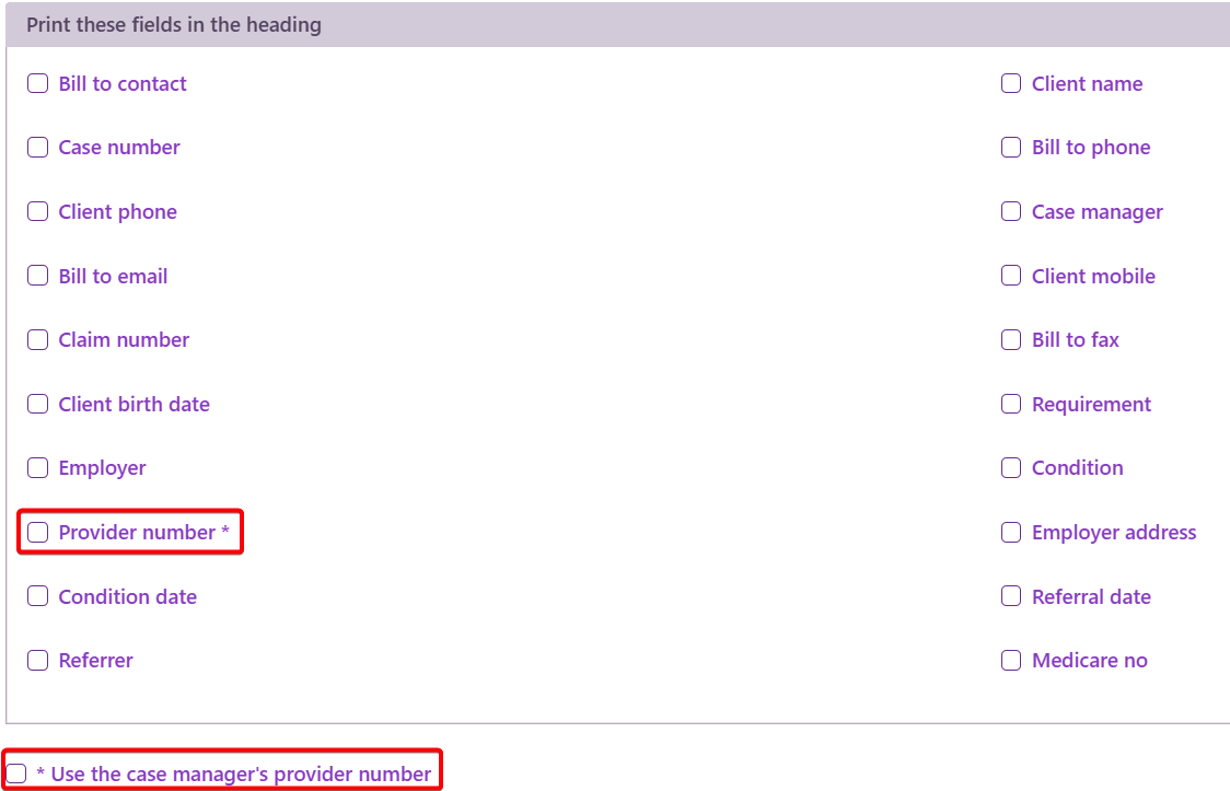 The standard invoice header provider number is derived from the case’s category. If you also select the checkbox for Use the case manager's provider number then you can display the provider number of the user who is the Assign To person for the case instead. See Provider numbers for details of how provider numbers are stored in the system.