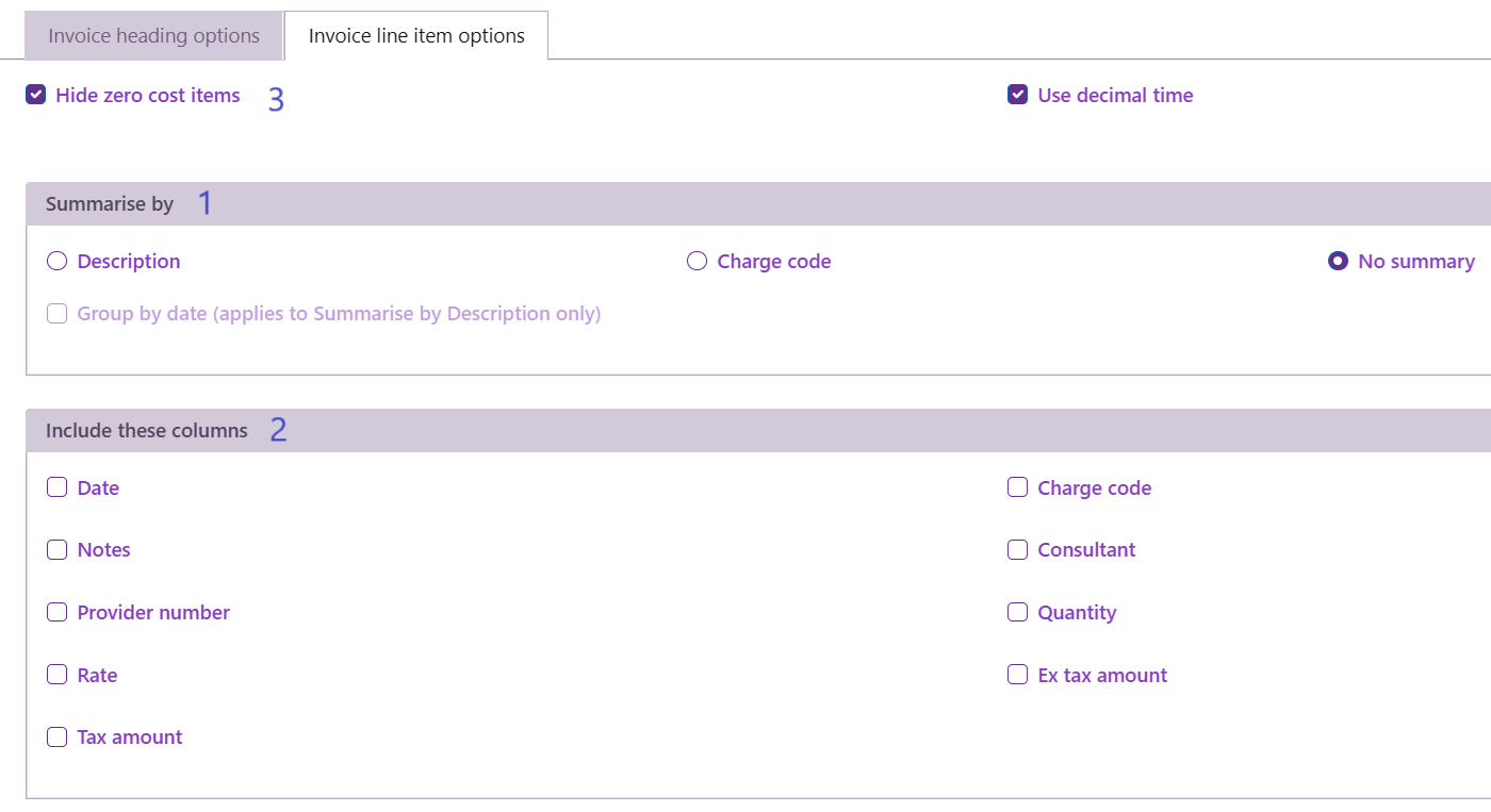 3. You can hide line items where the cost is $0 and specify that time is expressed as decimal values rather than hours and minutes.