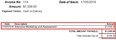 As you can also see above, the total amount payable and the tax included are shown at the bottom of the line items (this is indicated at E in the diagram at the top of the screen). This placement is specified in the Report Designer.