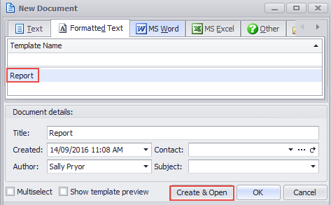 We select the Report formatted text template and click Create & Open. Our new document opens, ready for the report text to be added: