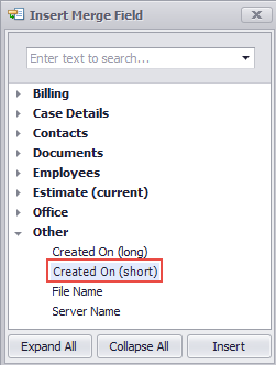 All the merge fields in the template were added using the Insert Merge Field window below.