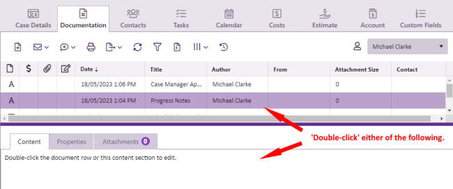 1. Begin by 'double-clicking' the document in the documentation grid (alternatively, you can select the document, then 'double-click' its content section):