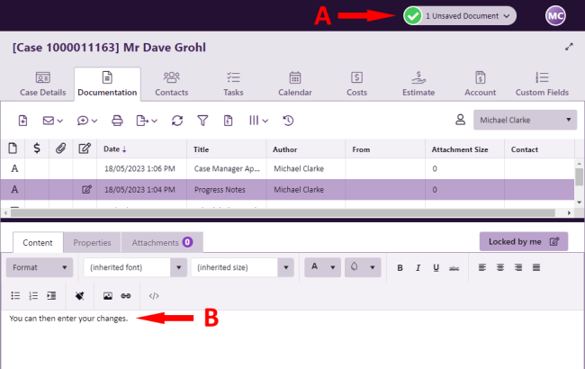 2. This will automatically acquire a file lock and load the document for editing (A):