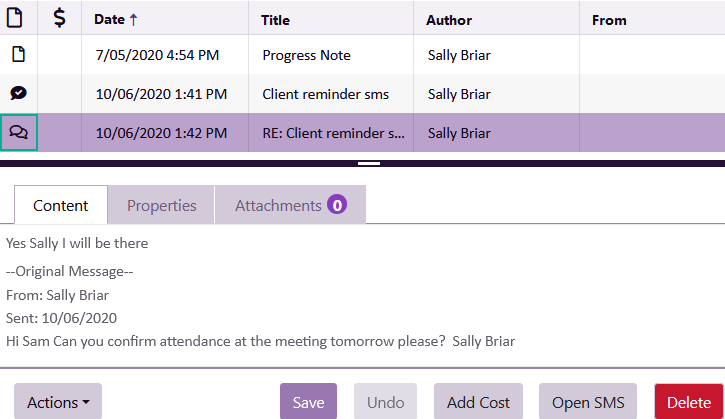 If the recipient replies to your SMS message the reply will return to Case Manager and join the list of documents.