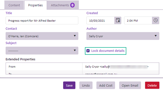 By default emails are locked via the Lock document details setting after they have been sent or received. You can see and change this in the Document details window.