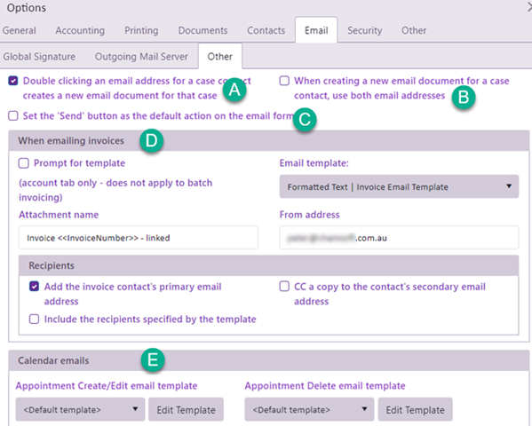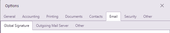System email set up includes the global signature for blank emails, global email server details, Case Manager's system email and other email options, including those for invoice emails.