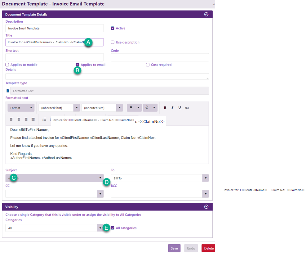 You specify which plain and formatted text templates are used for emails sent from the case, see B in screenshot below. This limits the number of templates available to select for emails and streamlines the process of sending an email.