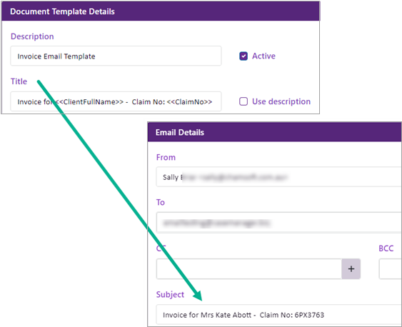 - Note that when you create an email with the template, the subject of the email is derived from the template's description or title, not the value of this Subject field. This is a separate document property and is displayed in the email's Document details tab.