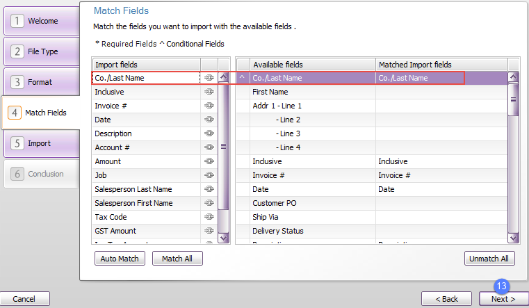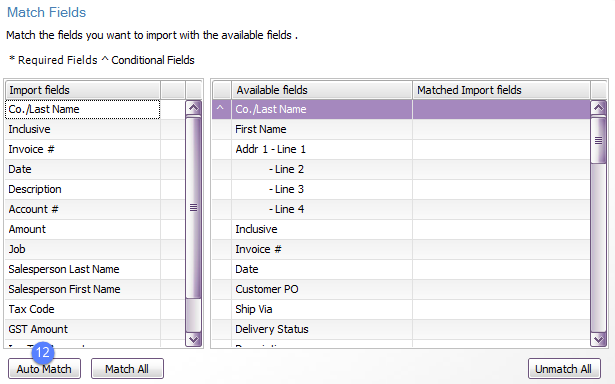 - Click Auto Match to automatically match the fields in your import file with MYOB fields that have the same name.