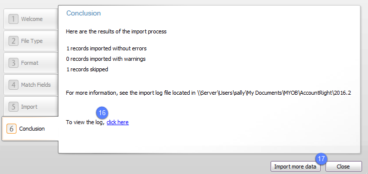 - The results of the import are displayed and the import log should be examined.