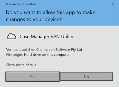 Users were typically presented with the Windows UAC prompt (pictured below) which authorises the VPN Utility prior to starting Case Manager: